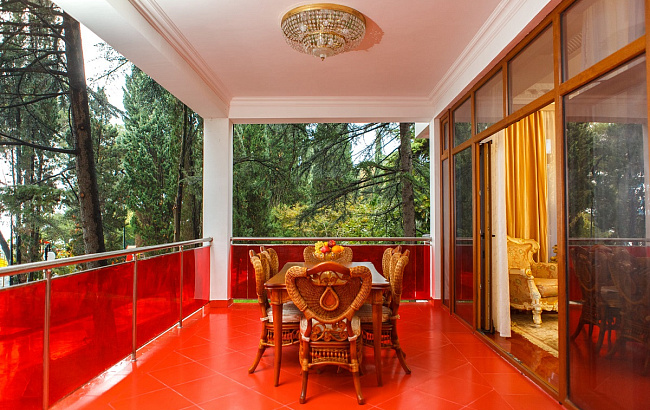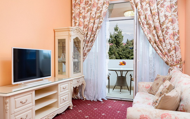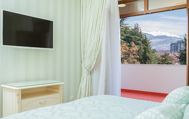 В номере двуспальная или две односпальные кровати, мягкая мебель, диван, мини-холодильник, телевизор, телефон, кондиционер, электрочайник, санузел с душем / ванной, фен, халаты и тапочки, балкон. Вид из номера на море, горы или дендропарк.