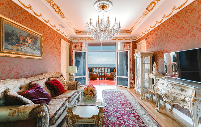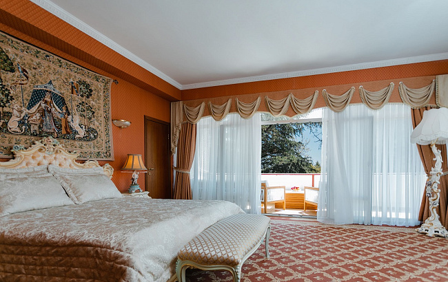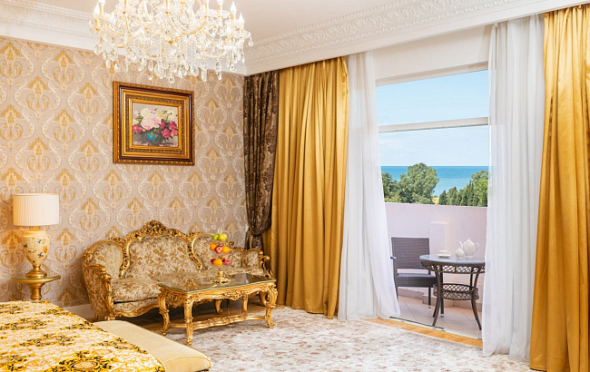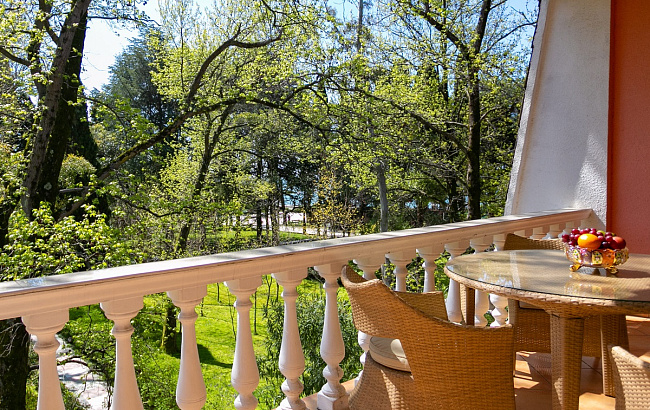 В номере двуспальная или две односпальные кровати, эксклюзивная мягкая мебель, диван, мини-холодильник, телевизор, телефон, кондиционер, электрочайник, чайный набор, утюг и гладильная доска, санузел с душевой кабиной / ванной, фен, халаты и тапочки, балкон с видом на море и дендропарк.
