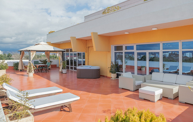 В номере двуспальная кровать, изысканная итальянская мебель, гостиная комната, ванная комната c джакузи и душевой кабиной, фен, халаты и тапочки, просторная терраса площадью 120 кв.м. оснащена беседкой, джакузи, ротанговой мебелью и шезлонгами.